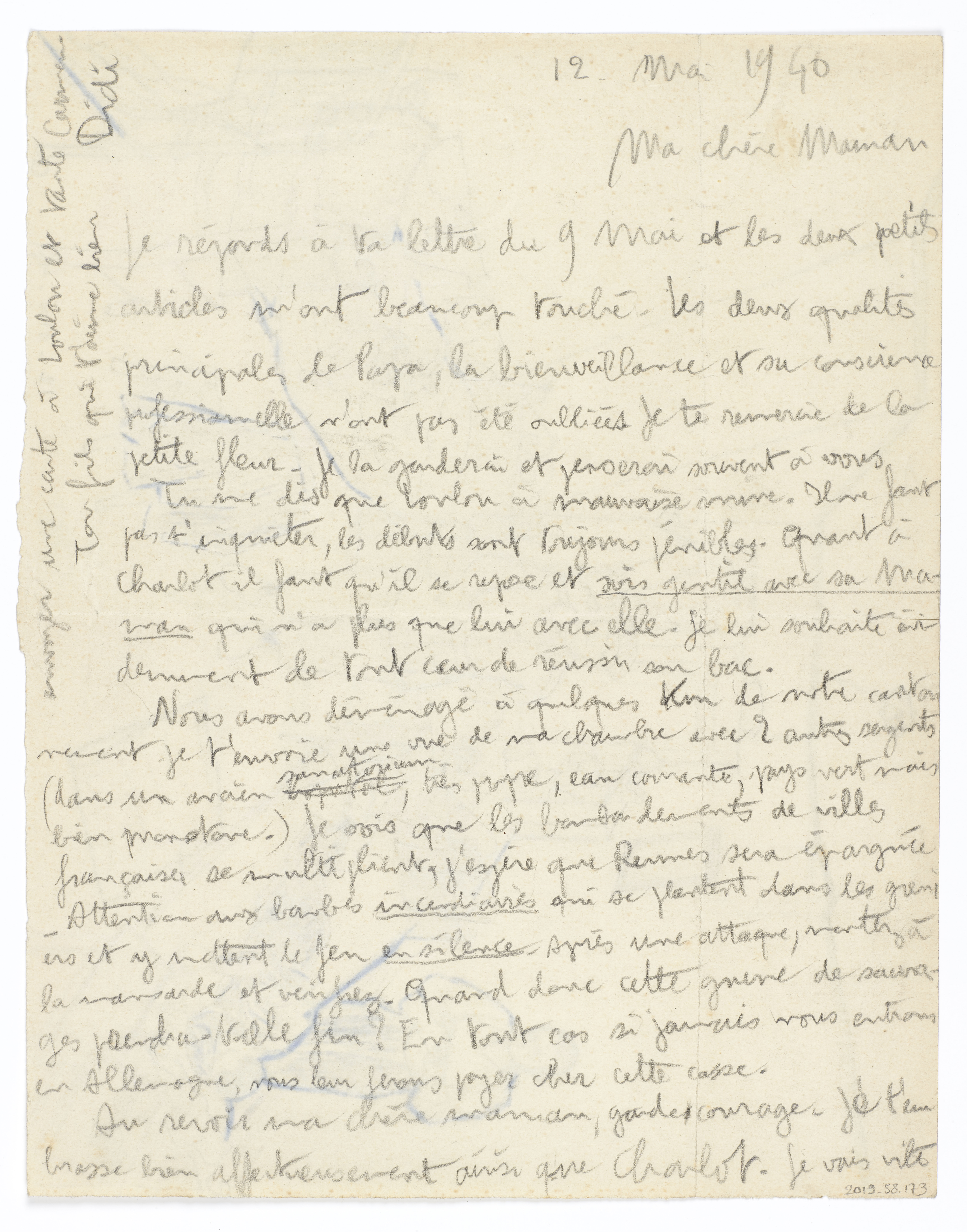 Transcription : 12. Mai 1940 / Ma chère Maman / Je réponds à ta lettre du 9 mai et les deux petits / articles m'ont beaucoup touché. Les deux qualités / principales de Papa, la bienveillance et sa conscience / professionnelle n'ont pas été oubliées. Je te remercie de la / petite fleur. Je la garderai et penserai souvent à vous. / Tu me dis que loulou à mauvaise mine. Il ne faut / oas t'inquiéter, les débuts sont toujours pénibles. Quant à / Charlot il faut qu'il se repose et sois gentil avec sa Ma- / man qui n'a plus que lui avec elle. Je lui souhaite évi- / demment de tout coeur de réussir son bac. / Nous avons déménagé à quelques km de notre canton- / nement. Je t'envoie une vue de ma chambre avec 2 autres sergents / (dans un ancien sanatorium, très propore, eau courante, pays vert mais / bien monotone.) Je vois que les bombardements de villes / françaises se multiplient, j'espère que Rennes sera épargnée / Attention aux bombes incendaires qui se plantent dans les greni- / ers et y mettent le feu en silence. Après une attaque, montez à / la mansarde et vérifiez. Quand donc cette guerre de sauvages prendra-t-elle fin ? En tout cas si jamais nous entrons / en Allemagne, nous leur ferons payer cher cette casse. / Au revoir ma chère maman, garde courage. Je t'em- / brasse bien affectueusement ainsi que Charlot. Je vais vite / envoyer une carte à loulou et tante Carmen. / Ton fils qui t'aime bien. Didi